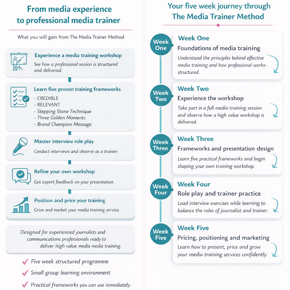 The Media Trainer Method is a five-week programme designed to give you everything you need to design, deliver and grow a credible media training service.